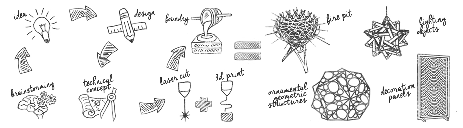 The production process combines modern techniques with the medieval, laser cutting and 3D printing with sand moulding and metal casting. Complex projects are designed with quick joints and asambley pieces without the requirement of bending materials or other processes. Our goal aimed at offering a range as varied objects outstanding and continuous development of technologies and production lines to meet the most demanding requirements of our customers.