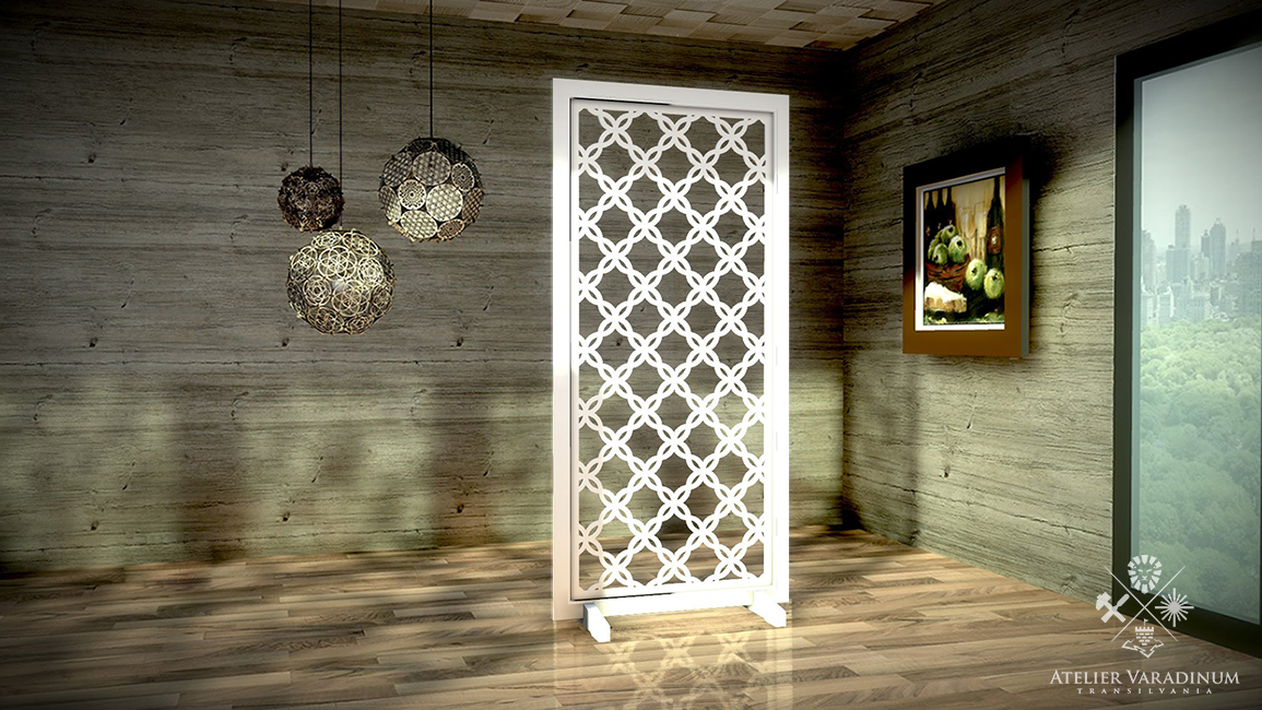 MDF decorative screen panel made with laser cutting, ideal for interior and exterior decoration, wall ornament or as a room divider. It can be ordered simple, just the panel itself, untreated and without the frame or complete with finished frame, base support and staining or painting. The panels are displayed in a standard size but we can make other sizes as well for different uses and applications such as heater mask, handrails, wall ornaments, decorations, furniture, dividers, wall embedded, doors, gates , fences, etc. Also on request you can ad your company logo or any customization to the panel.