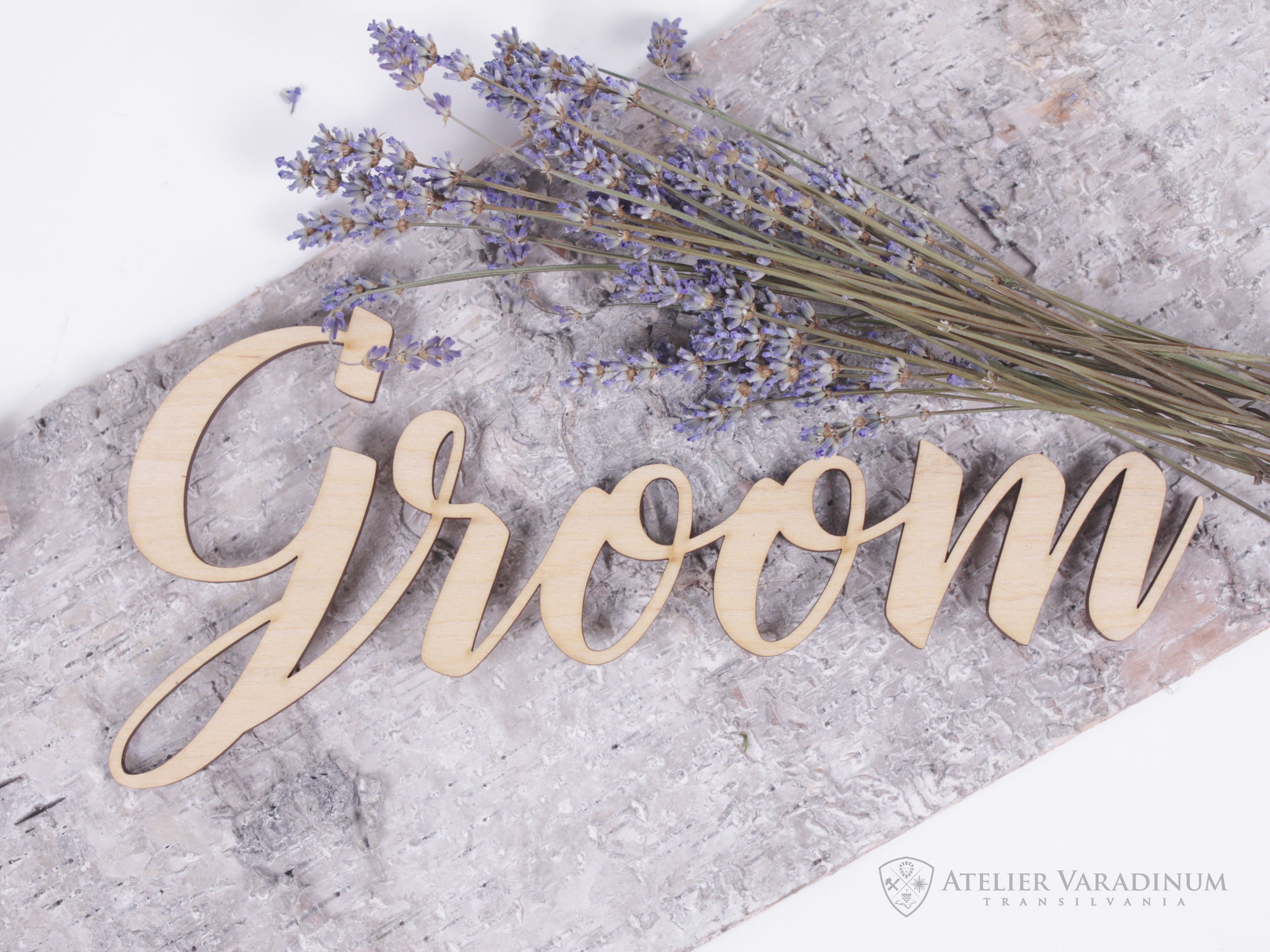 Oferim un decor unicat si expresiv pentru nunta, inscriptionat cu textul "Groom" si "Bride", realizat prin debitare laser.