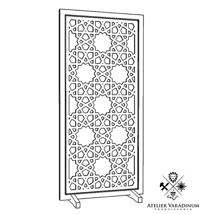 Panou decorativ din MDF realizat prin debitare laser. Panoul se poate comanda simplu doar placa debitata, netratata sau complet finisat cu rama, talpa de sustinere si vopsire sau baituire dupa caz.