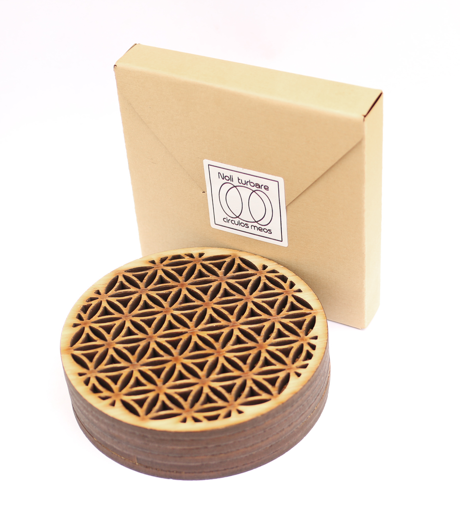 Set 6 buc. Suport / Coaster pahar Floarea Vietii din furnir stejar, realizat prin debitare laser, in ambalaj din carton.