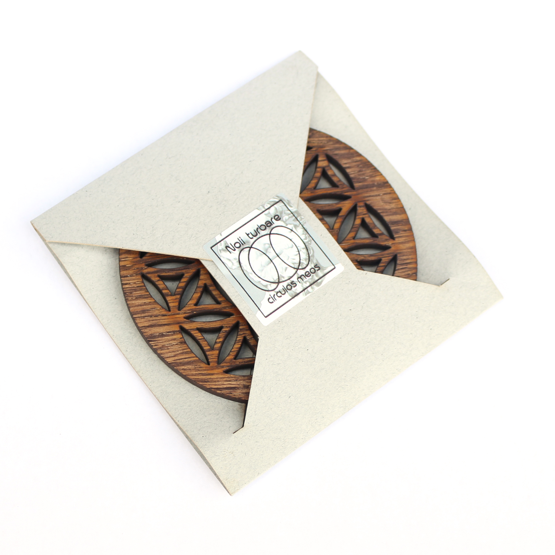 Suport / Coaster pahar Samanta Vietii Evolutie din furnir stejar, realizat prin debitare laser, in ambalaj din carton.